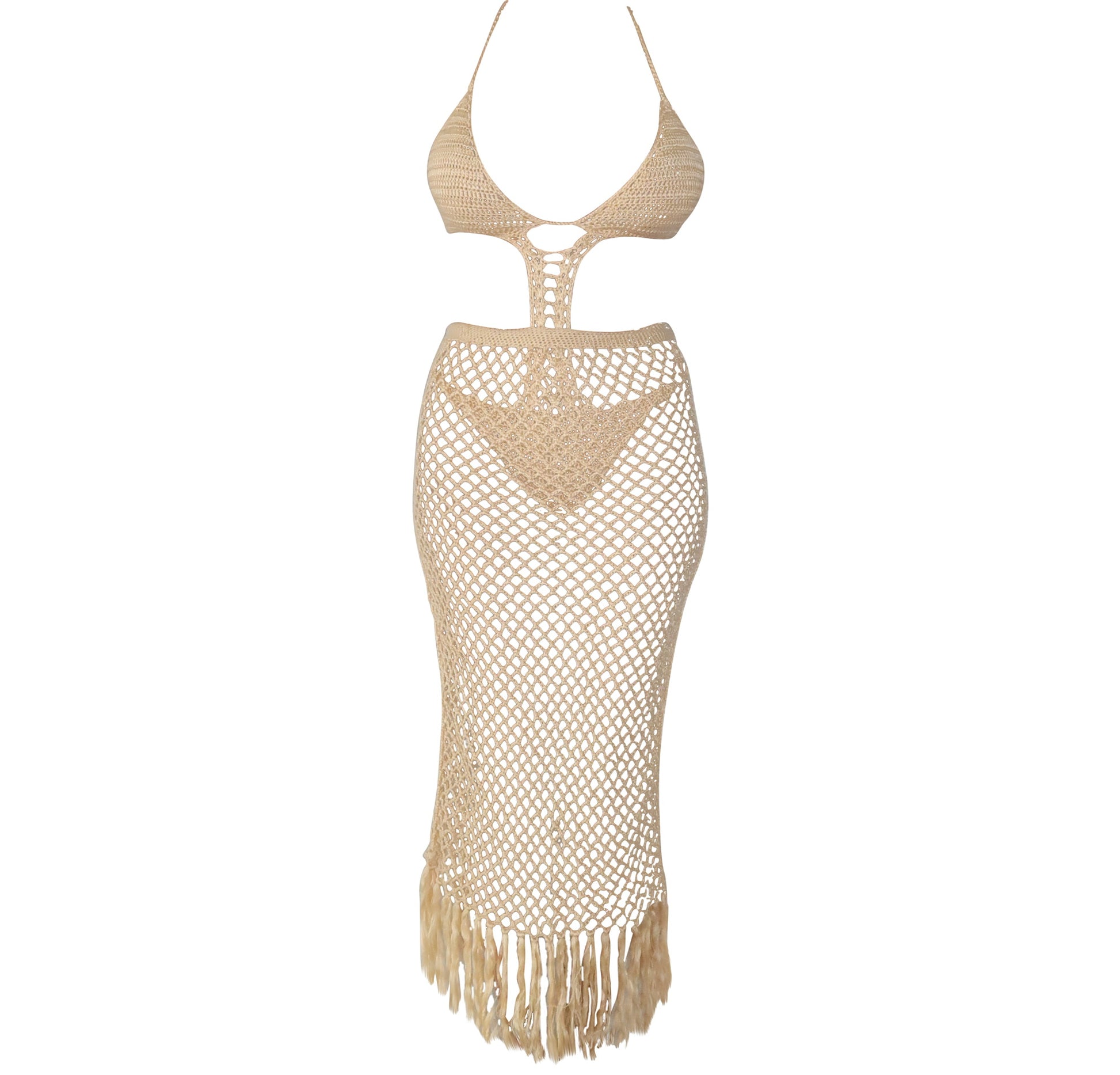 The Knit collection has been in the works for over a year, we’ve tested knits of all kinds to make sure our resort wear is of the best quality and durable after water wear. Designed for the Caribbean girls. This One piece swim and the cover up skirt is available in the color ECRU.