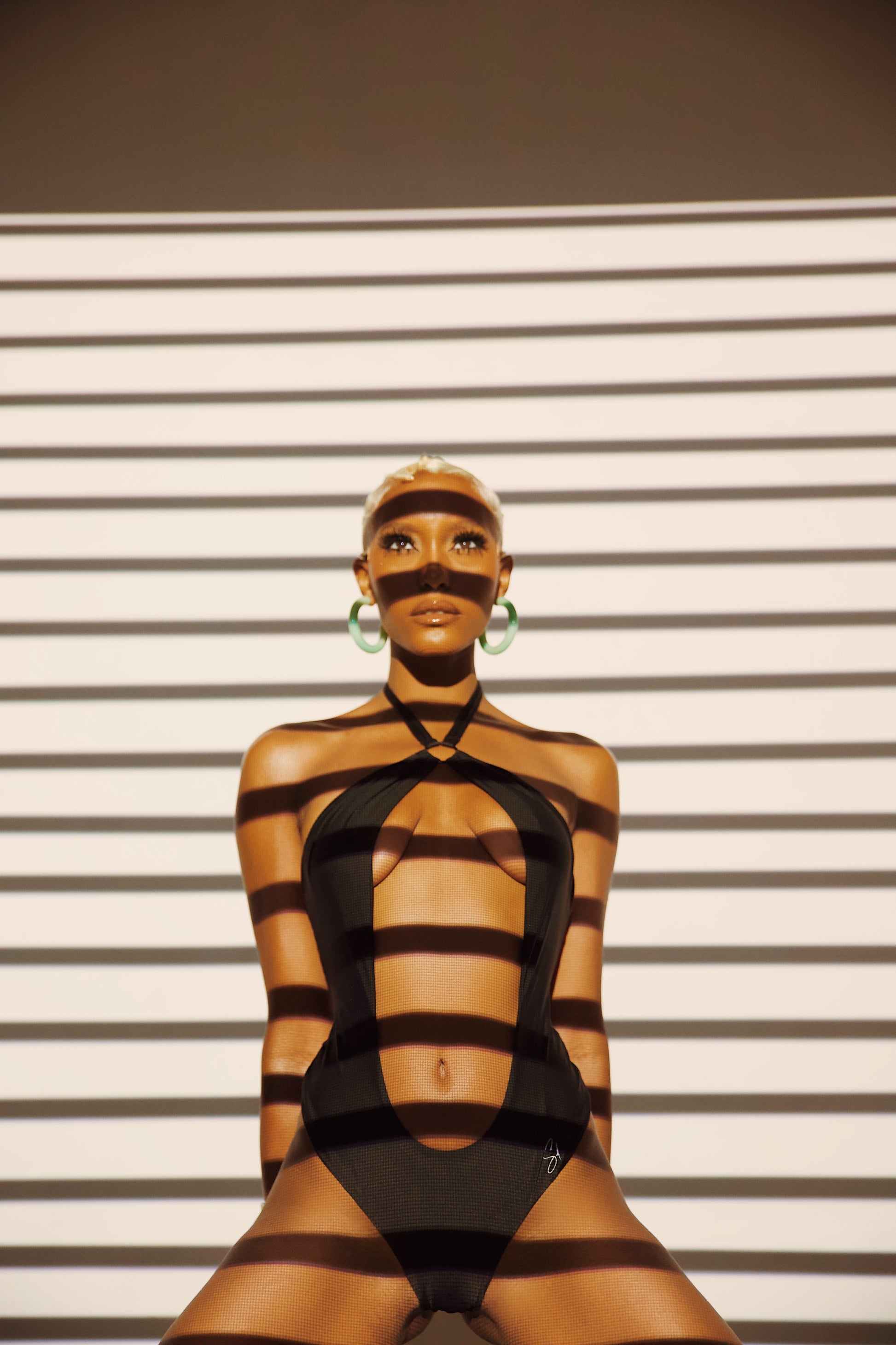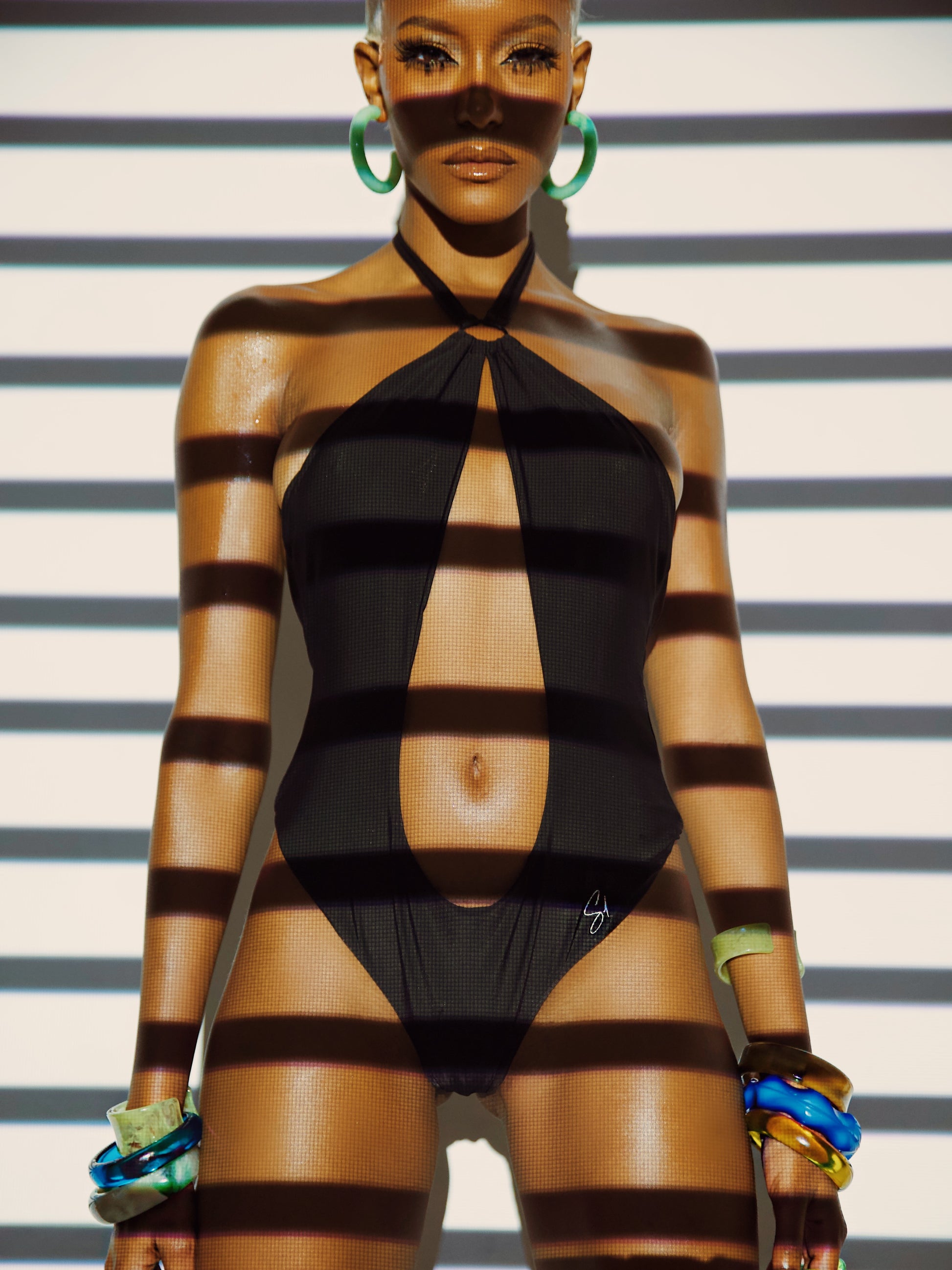 JET, a one piece suit that is just as sexy as any two piece. This suit features a Brazilian cut bottom, silver ring hardware, the halter strap can be tied to your desire fit.