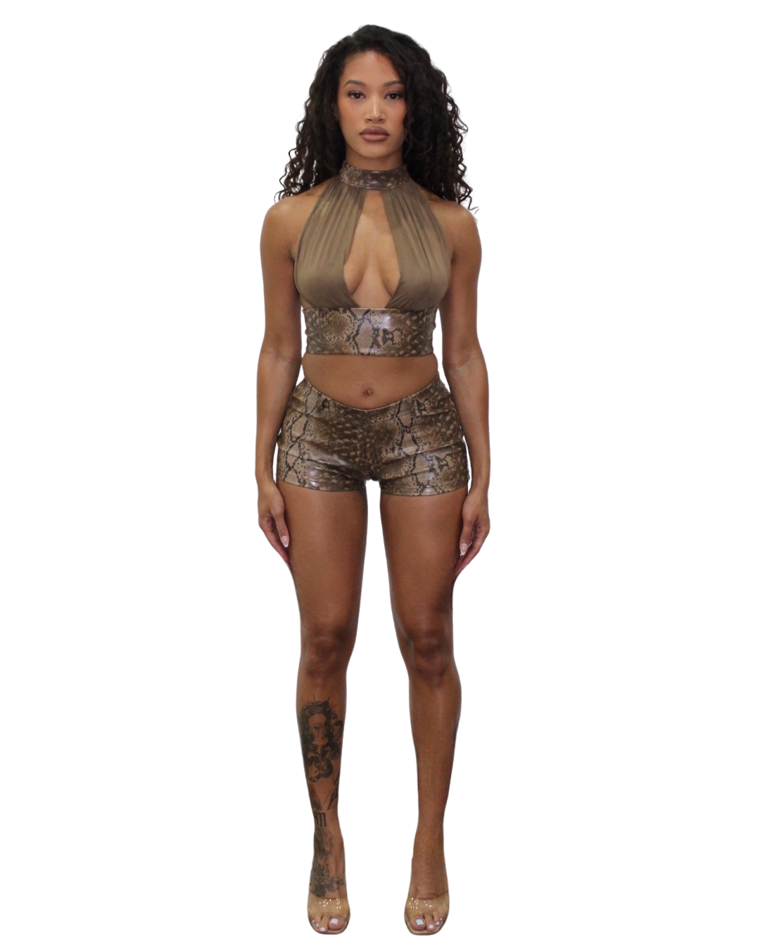 Effortlessly sultry, this set pairs a plunging halter top with fitted mini shorts in rich brown faux leather with a python print. The shorts run small, offering a curve-hugging fit—we recommend sizing up for comfort. Finished with stretch for ease of wear.