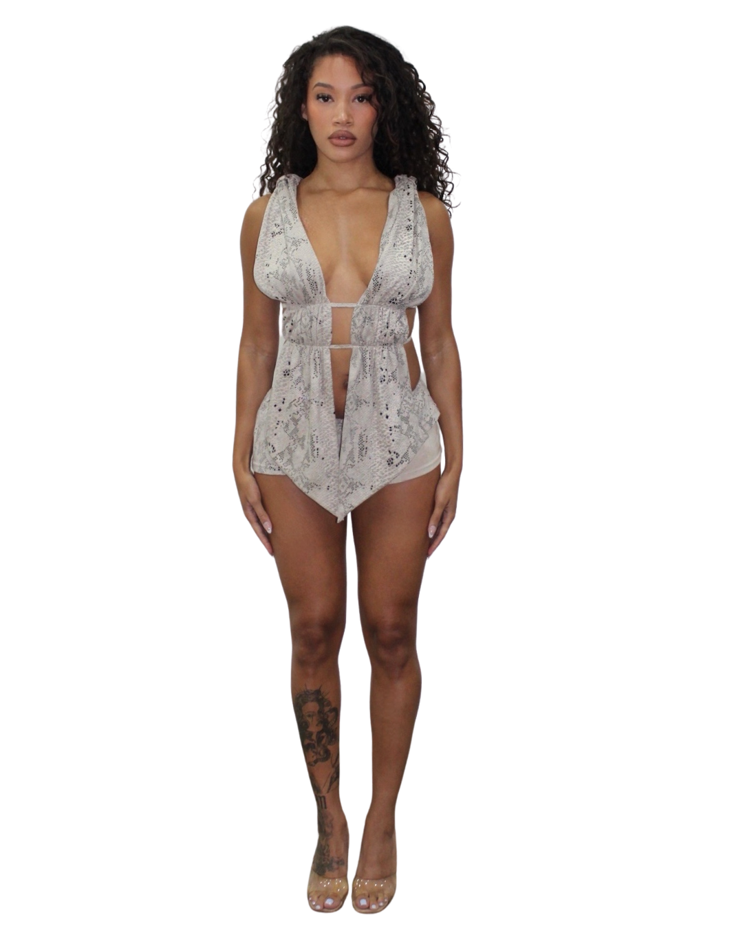 A two-piece set blending python print with cream suede for a striking contrast. The top features a lace-back detail with subtle stretch for a perfect fit, paired with coordinating mini shorts for a fierce finish.